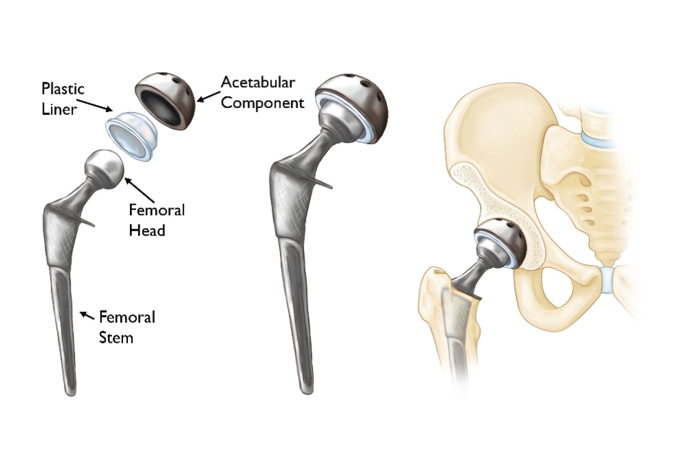 In any hip replacement, the damaged ball-and-socket joint is resurfaced with implants which is a stem fitted inside the thigh bone (femur) with a ball on top, and a cup placed in the pelvis (acetabulum).